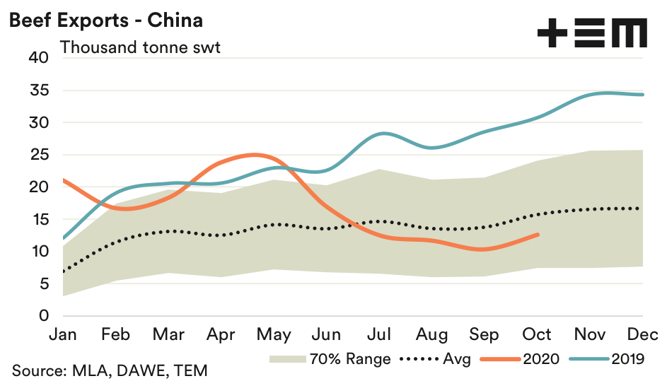 - Beef trade volumes from Australia to China during October 2019 were 143% higher than the levels achieved during October 2020.