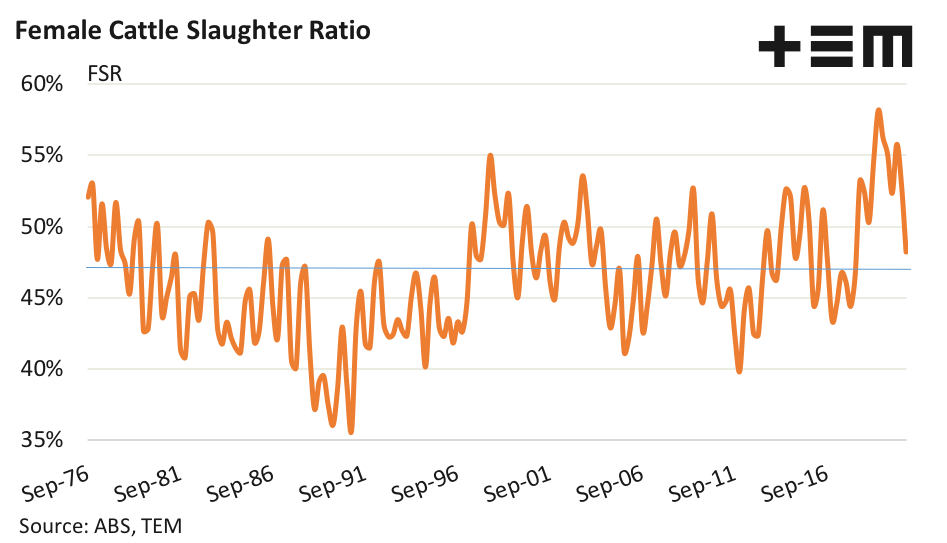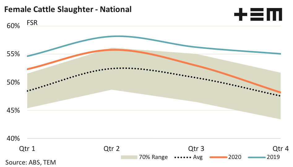Australian Bureau of Statistics (ABS) quarterly cattle slaughter data to the end of 2020 has been released today and it is the first opportunity to see if the herd is in a technical rebuild yet. The threshold to denote rebuild or liquidation is a female slaughter ratio (FSR) of 47%.