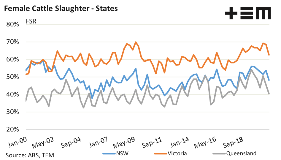 Bear in mind that the threshold FSR to denote rebuild/liquidation is different in each state as their reproduction success and calf branding rates vary. Generally speaking, Queensland needs to hold a higher proportion of females in their herd than the southern states so their threshold between rebuild to de-stocking is closer to 40%. The higher proportion dairy cull cows in Victoria also means their FSR remains at a higher ratio.