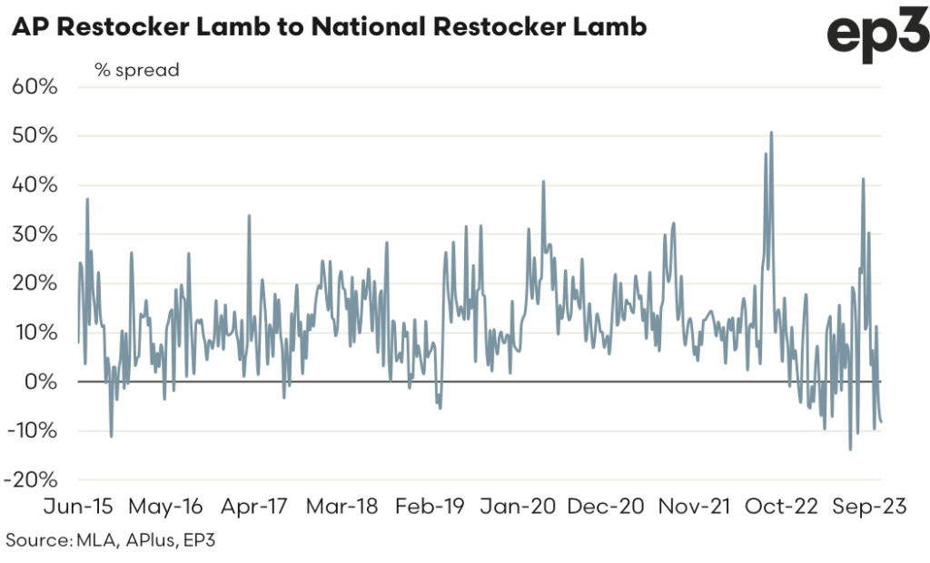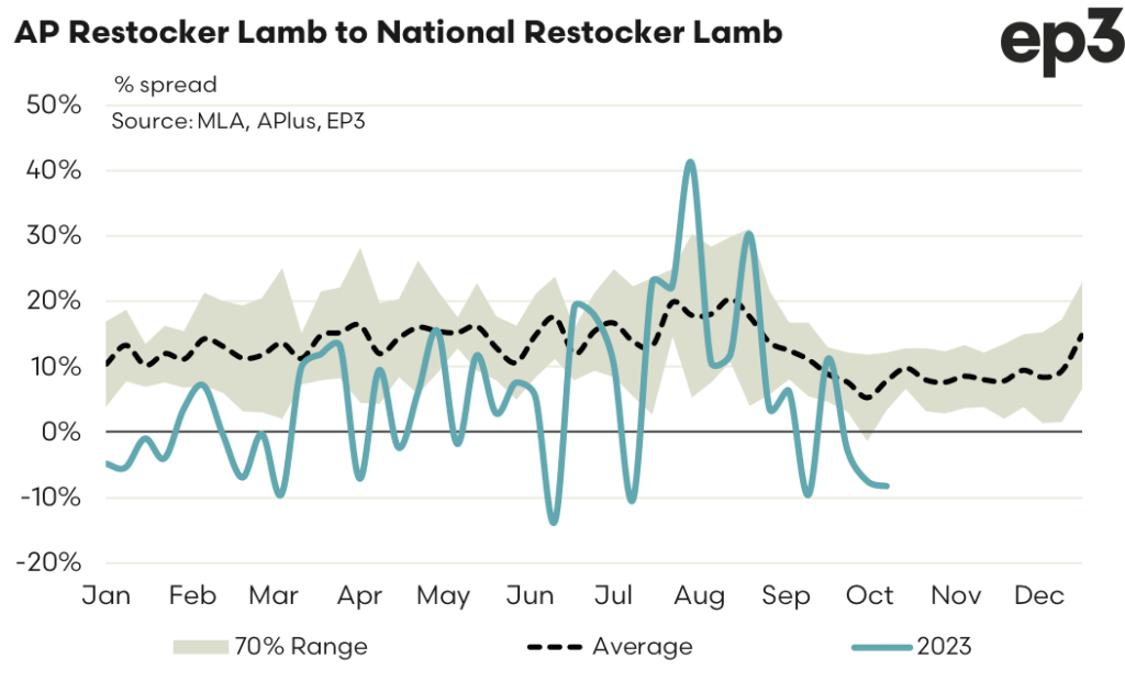 AuctionsPlus publish a Restocker Lamb Indicator (ARLI), which updates daily as sales progress through the week. As of last week (week ending October 20), the ARLI sat at 325c/kg cwt. Compared to the National Restocker Lamb Indicator (NRLI) as published by Meat & Livestock Australia (MLA), average weekly pricing for the ARLI was running at a 29 cent discount, or 8% below the MLA National Restocker Lamb.