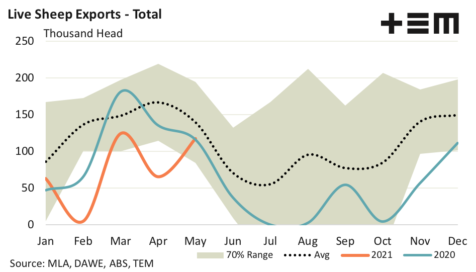 The monthly live sheep flows in May are the second highest recorded during the 2021 season, just 5% shy of the 124,277 head seen during March. Despite the strong rebound in May volumes remain 16% below the five-year average trend for May and have been running 45% under trend all season.