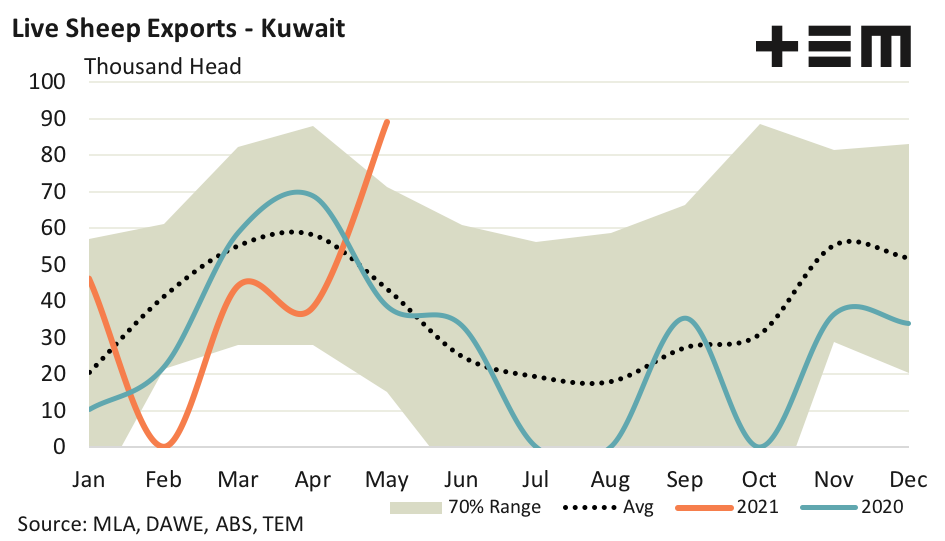 Kuwait have increased the proportion of their share of the total trade from 42% in 2020 to 58% this year. Live sheep flows from Australia to Kuwait over May increased 137% to see 89,144 head transported for the month. This level represents volumes that are 106% above the five-year average for May, so it seems the Kuwaiti importer is keen to get volumes in ahead of the looming shutdown.