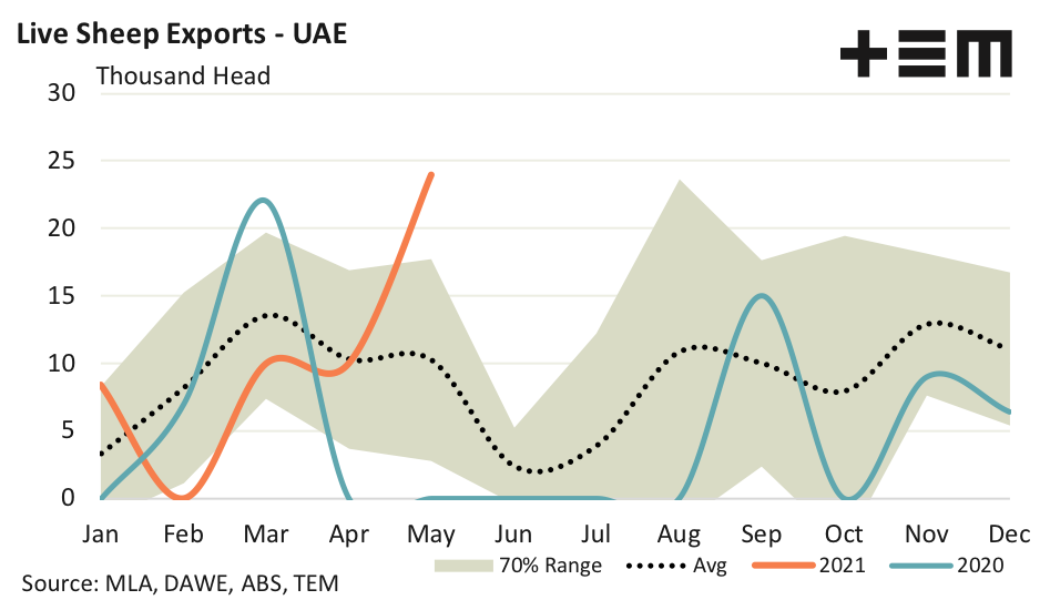 - During May the UAE has seen live sheep export volumes from Australia rising by 140% to see 24,000 head transported.