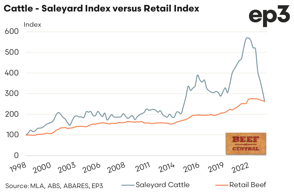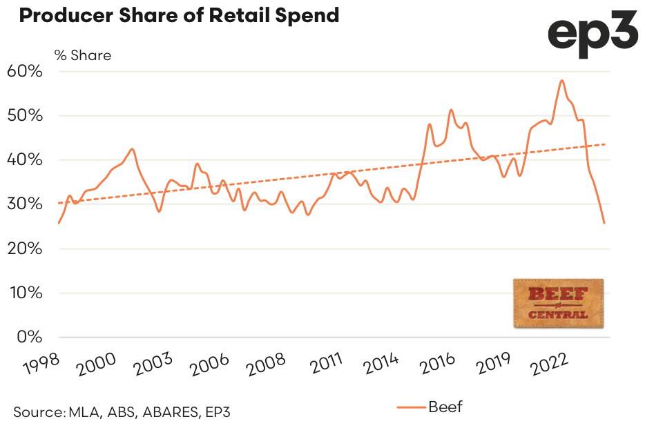 The steady decline in saleyard cattle prices during Q4 2023, combined with the marginal easing of retail beef prices, saw the beef producer share of the retail dollar spend on beef drop to the lowest point since the data began reaching a lull of 25.8%. This is exactly where the indicator began back in Q1 1998.