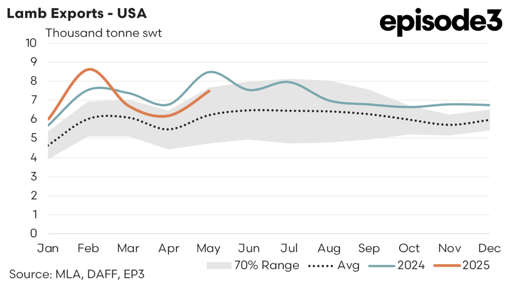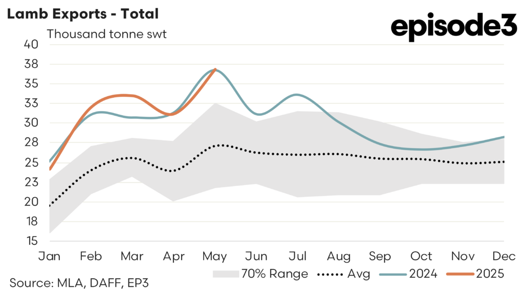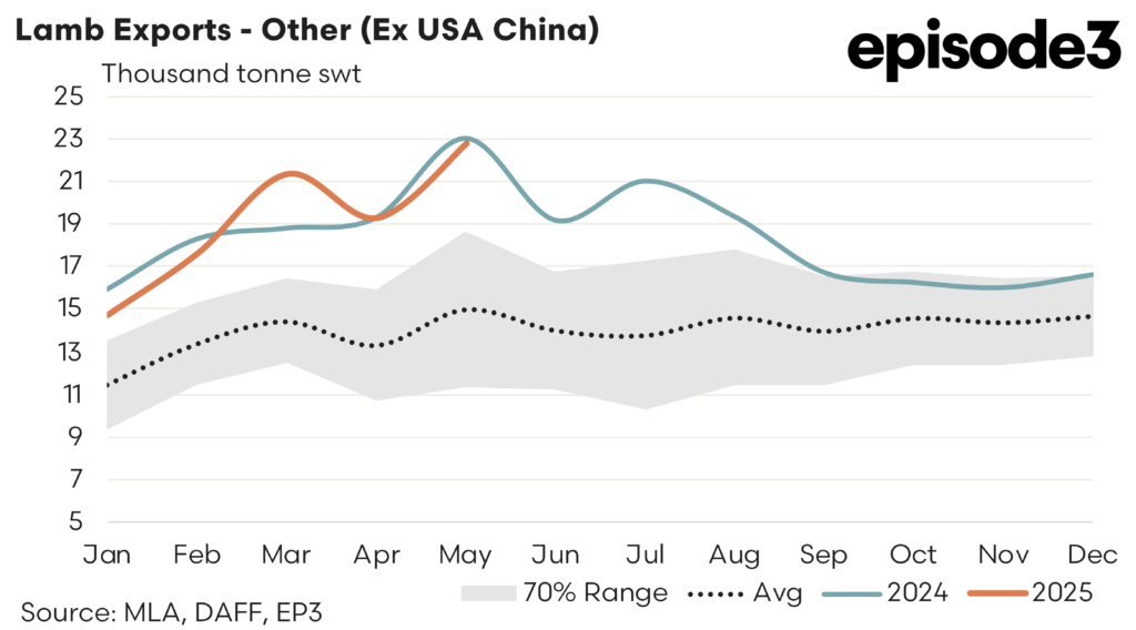 The others – There was a solid rebound in trade volumes to other destinations (ex China and the USA) during May after April recorded a 10% easing. May 2025 saw lamb exports from Australia to the “others” lift by 18% to see 22,752 tonnes shipped offshore. This represents levels that are a huge 52% above the five-year May average volumes and a whisker away from the strong May result seen in 2024.