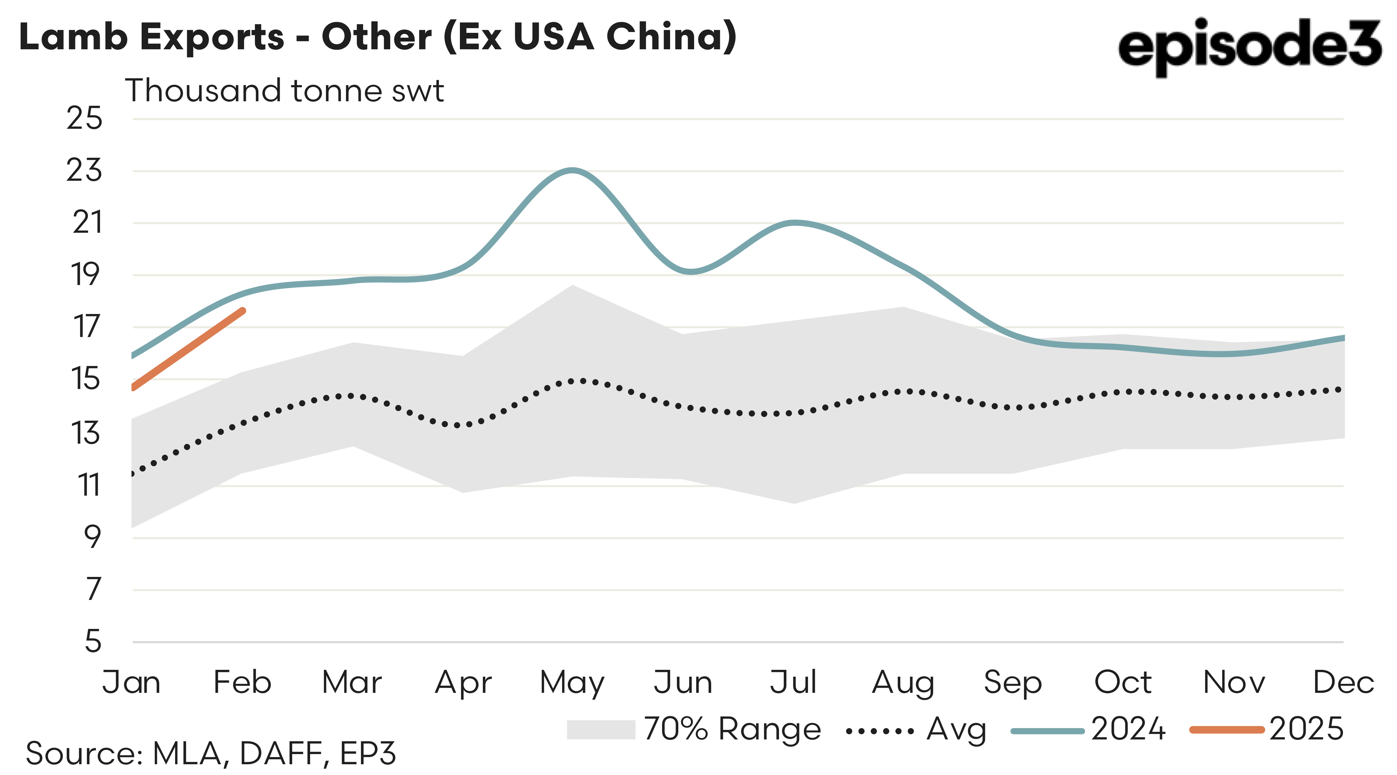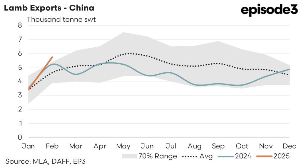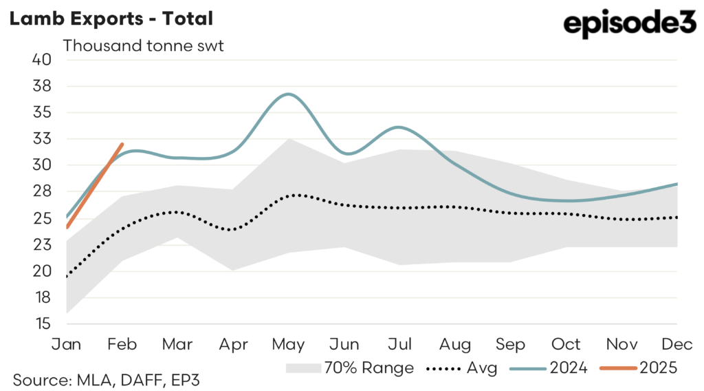 The trend pattern for 2025 of Australian lamb exports is closely mirroring the 2024 path, but it is only two months into the new season. February 2025 saw 31,977 tonnes shipped, a marginal 1.5% ahead of the February 2024 levels. However, compared to the five-year average pattern the current flows are running 33% higher.