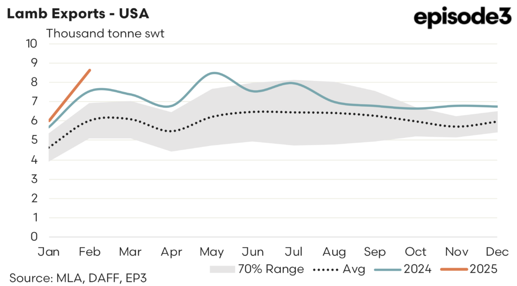 USA – There was 8,621 tonnes of Aussie lamb shipped to the USA in February, which is a new February record volume. This is coming off the back of a record volume set in January 2025 too. The current February flows to the US came in nearly 15% higher than the previous February and last year was the prior record holder for February lamb export volumes from Australia. Compared to the five-year average trend for February current trade volumes are running 43% stronger.