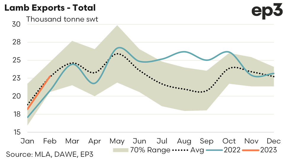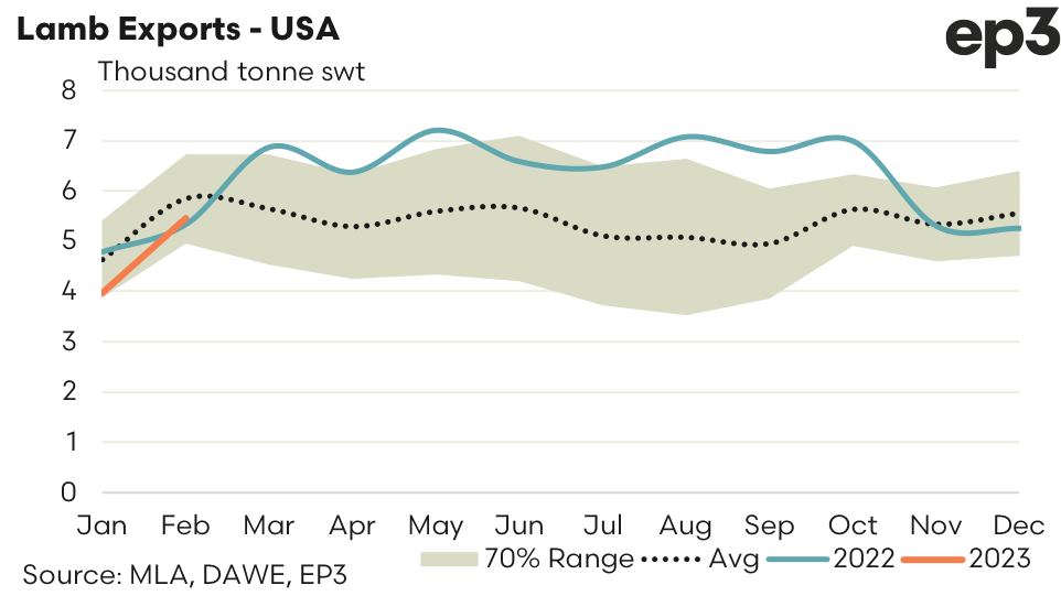 Total Australian lamb exports remained close to the five-year average pattern over February 2023 with 22,769 tonnes swt reported shipped for the month, an increase of 25% on the flows seen exported over January. The top destination for Aussie lamb, the USA, remains a little subdued in their demand with volumes running about 10% under the five-year average pattern so far this year after 5,451 tonnes was reported consigned for February.