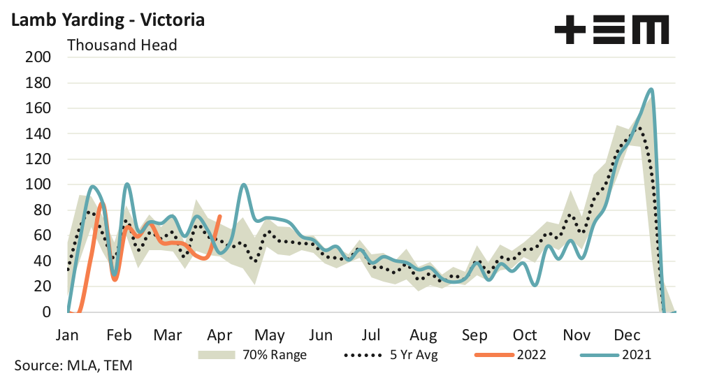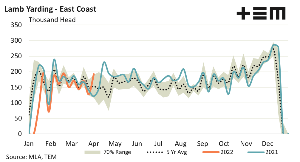 East coast lamb throughput lifted strongly as April 2022 arrived, numbers presented at the saleyard rose by 50% for the week ending 1st April compared to the week prior with 192,214 head of lamb noted. This is the highest weekly volumes of lamb presented at east coast saleyards in six weeks and current numbers are sitting 25% above the five-year average seasonal pattern for this week in the year.