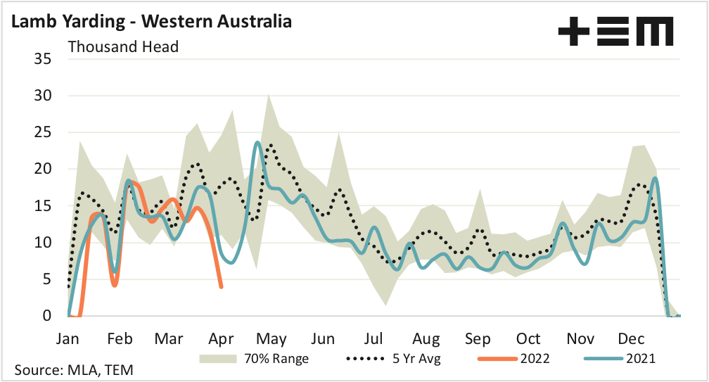 Over in the west lamb throughput numbers have fallen off a cliff. Just 3,950 lambs were presented at WA saleyards for the week ending 1st April, which is a 66% drop on the previous week. Compared to the five-year average pattern WA lamb throughput volumes are running 78% under trend and these meagre weekly yardings figures are the weakest seen so far for 2022 in WA.