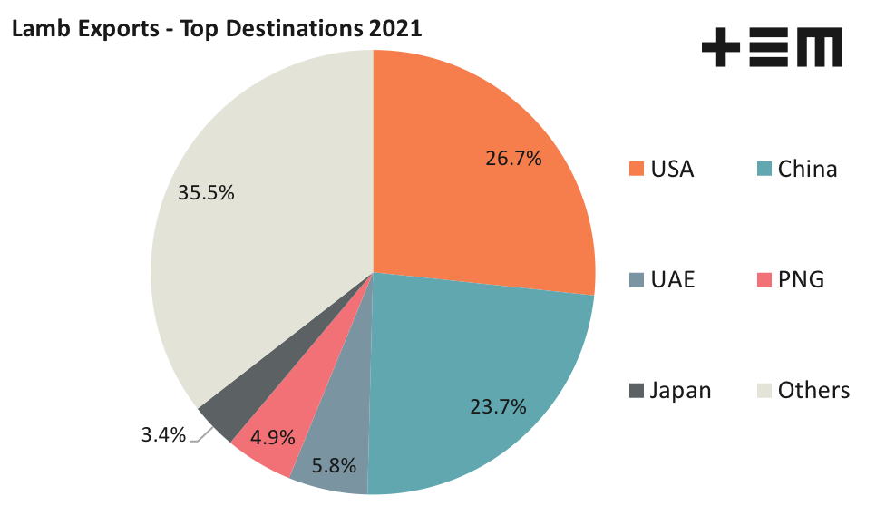 - The USA have consolidated their position as top export destination for Aussie lamb exports with their market share of the trade moving up from 23% in 2020 to 26.7% in 2021.