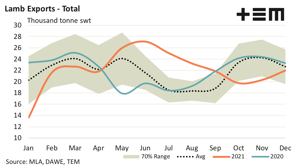 - Total Australian lamb export flows hit 264,823 tonnes for 2021, just 953 tonnes above the 2020 total lamb export volumes.