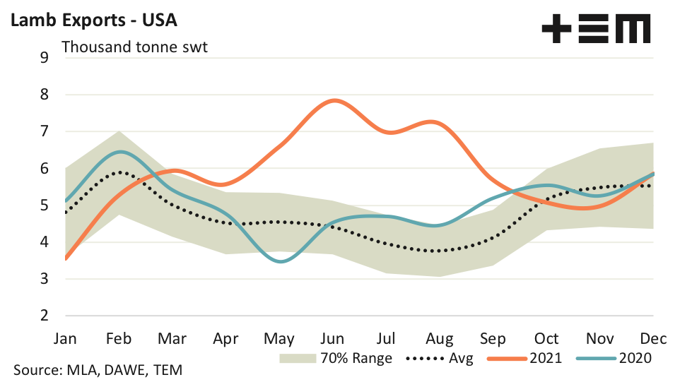 - Annual Aussie lamb exports to the USA reached 70,606 tonnes in 2021, the highest annual figure on record and 16.4% higher than the levels seen in 2020.
