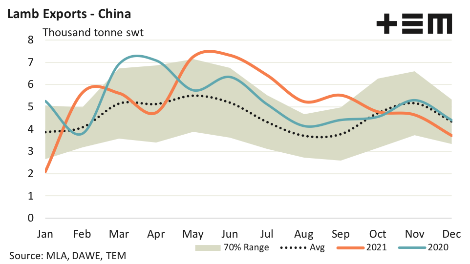 - Total Australian annual lamb exports to China in 2021 came in just 216 tonnes lower than the 2020 tally with 62,882 tonnes reported shipped last year.