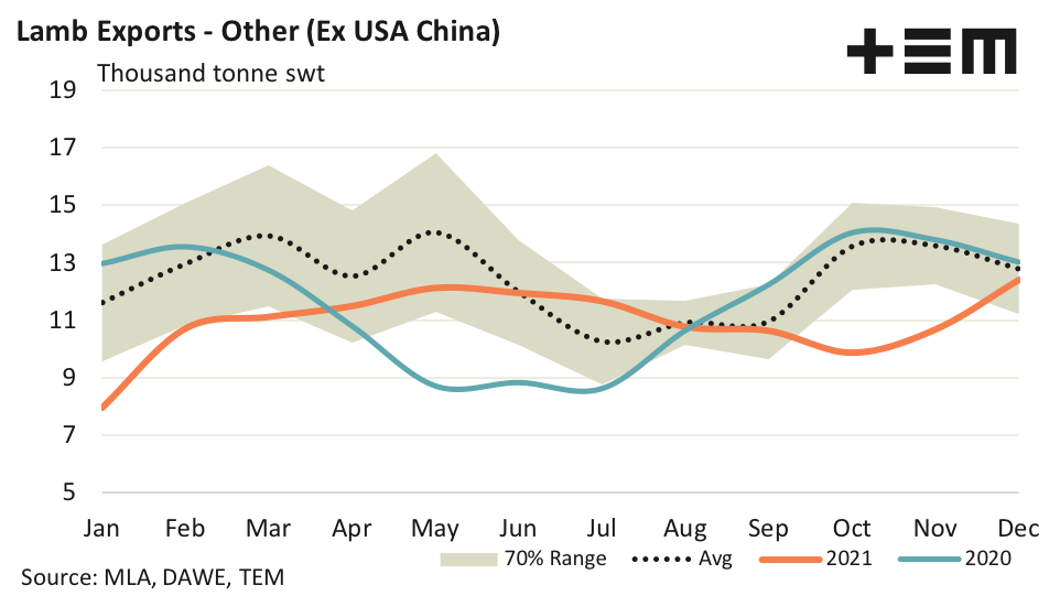 In a positive sign for 2022, other lamb export markets (ex USA and China) finished the 2021 season in an upbeat fashion. In December 2021 Australian lamb exports to “other destinations” increased 16.1% to 12,401 tonnes swt. However. much of the 2021 season was spent below the average seasonal trend and the total annual flows for lamb exports came in at 131,336 tonnes, which represents volumes that are nearly 12% below the five-year average annual tally of 149,095 tonnes.