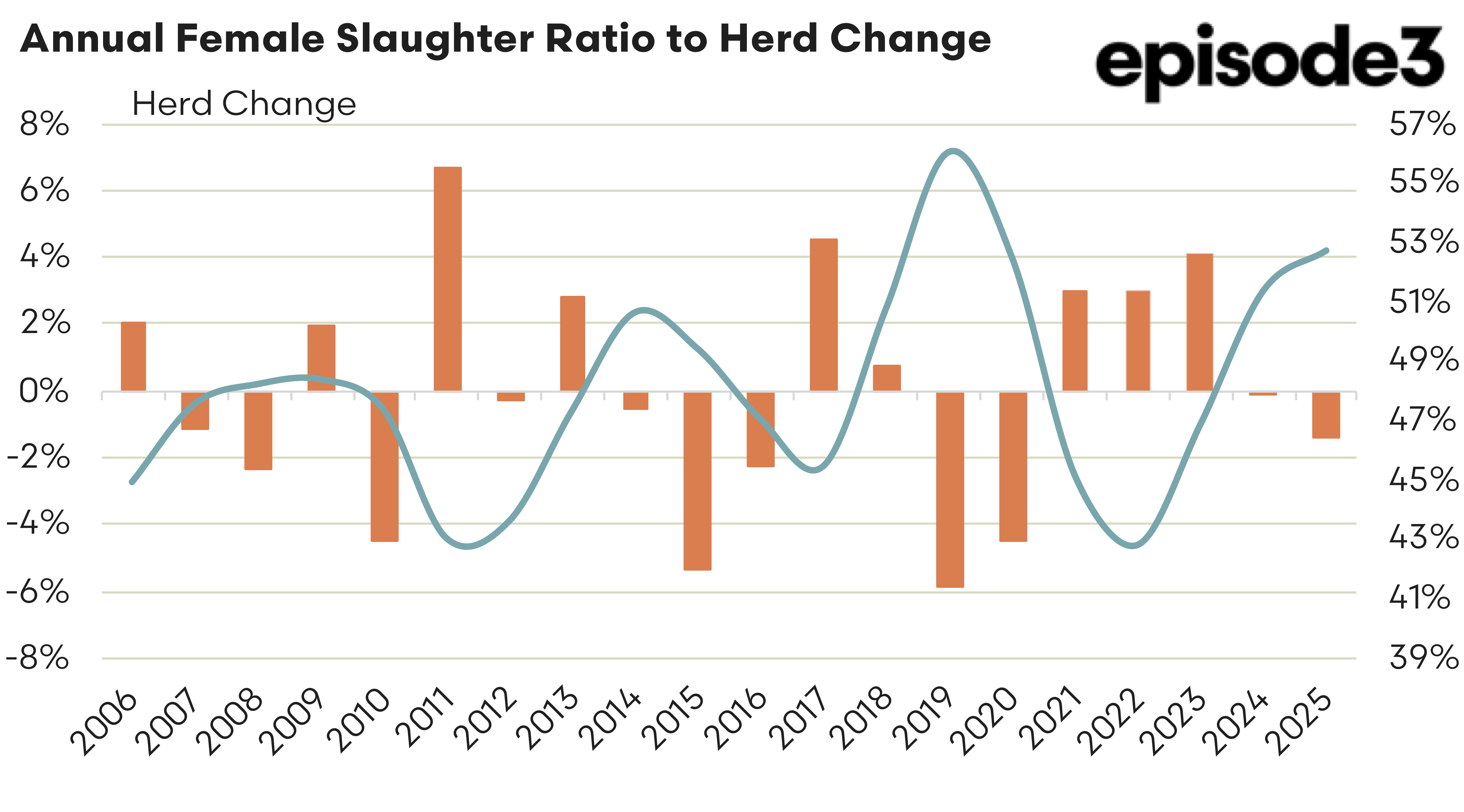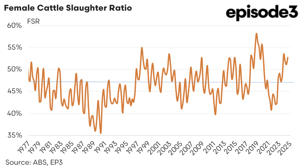 The ABS cattle slaughter data released earlier this week shows that, at least in technical terms, the national herd remains in a mild liquidation phase. The female slaughter ratio (FSR), a reasonably reliable historical measure of the cattle herd cycle, came in at 52.7% for Q1, 2025. This is a slight move up from the 51.1% FSR reported as at the final quarter of 2024.