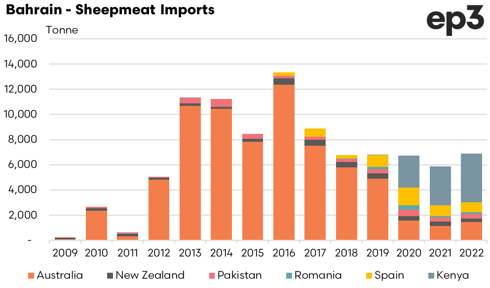 However, let us take a look at Bahrain and see if this trend has been replicated. In terms of Australian boxed sheep meat market share, Bahrain was placed 27th in 2022 with around 1,400 tonnes swt consigned. Meanwhile, Bahrain hasn’t imported any live sheep from Australia since 2016. From 2009 to 2016 there was strong growth in boxed sheep meat imports into Bahrain, with Australia taking a large share of this trade and averaging 71% of the export flows from 2010 to 2019. However, since 2020 Kenya and Spain have started to compete aggressively for market share resulting in the Australian proportion of the boxed trade dropping from near 60% in 2019 to around 15%-20% in recent years.