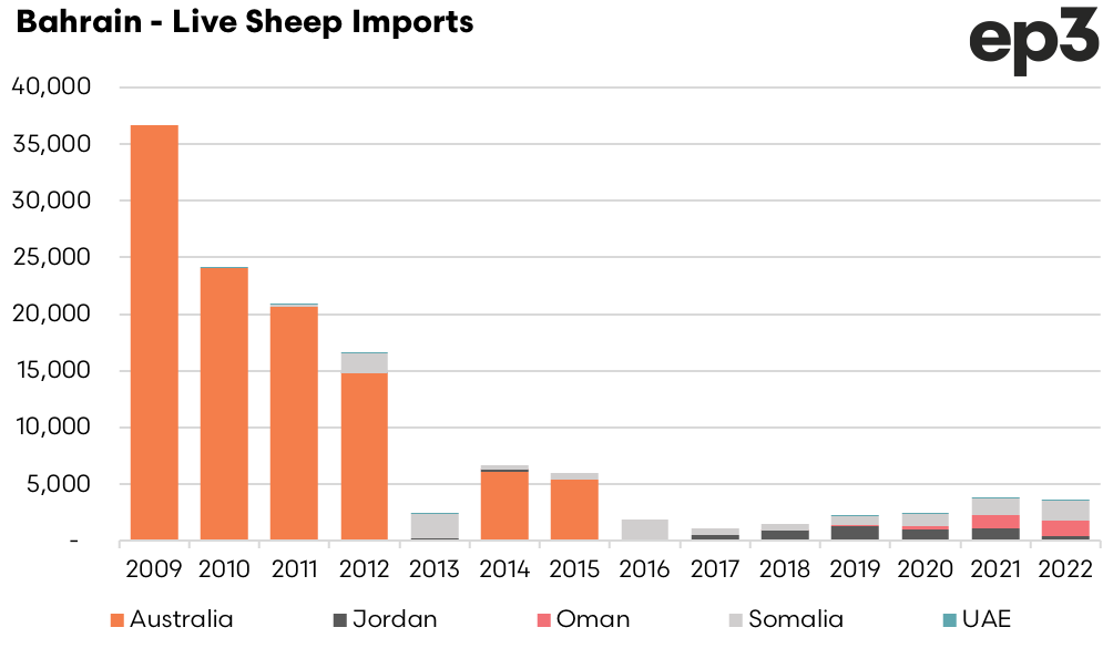 Just as a final complication to the picture, a comparison of the Saudi Arabian boxed versus live trade shows that Sudan and Spain have enjoyed increased boxed access along with a developing presence in the live trade, which lends weight to the argument that live sheep access is a leverage for the boxed trade. However, the Bahraini experience shows that their primary live sheep source nations of Jordan, Oman and Somalia don’t provide any boxed sheep meat imports.