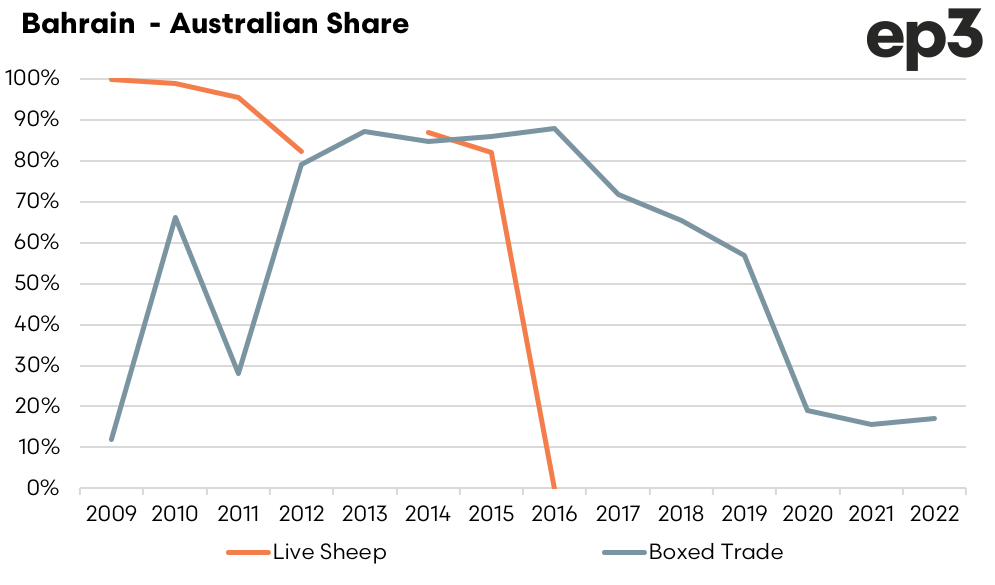 Just as the Saudi Arabian experience was a promising tale of the demise of the live sheep trade not impacting boxed export volumes from Australia the Bahraini experience could serve as a somewhat cautionary example that there could still be some correlation between live sheep export access promoting boxed access. As the market share chart below demonstrates, the sharp decline in Australian market share of the live trade into Bahrain was a precursor to the steep drop in the boxed trade from 2016 to 2020.