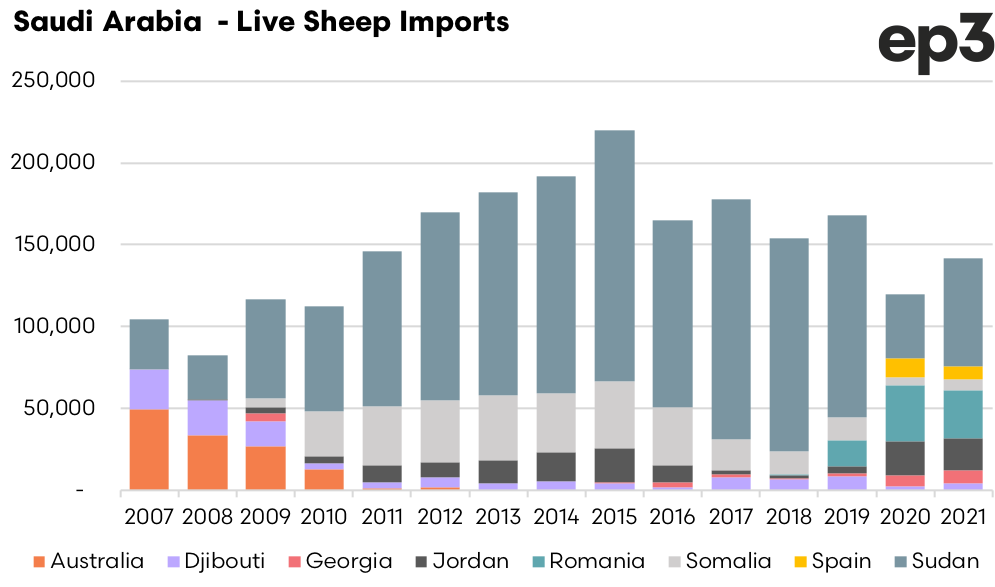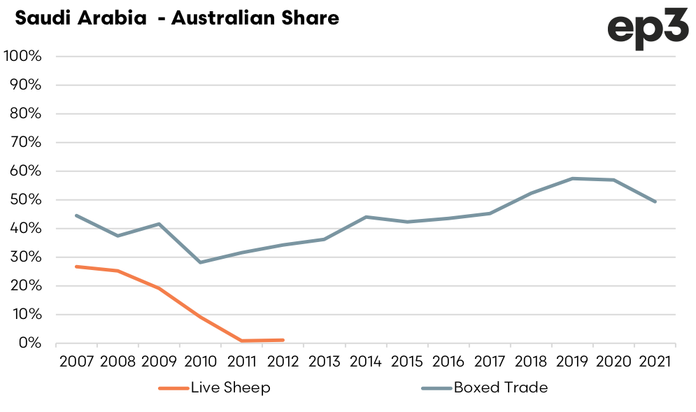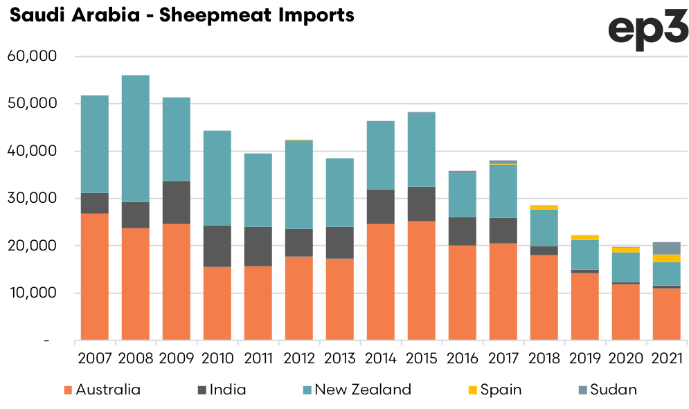 Saudi Arabia is a significant importer of boxed sheep meat from Australia, sitting in 9th place as one of the top ten destinations for Australian sheep meat exports in 2022 on 11,334 tonnes swt. Saudi Arabia is the second highest destination for Australian sheep meat in the MENA region, behind the UAE. Historically, Australian boxed sheep meat imports into Saudi Arabia have featured prominently alongside flows from New Zealand and, to a lesser degree, India. However, in terms of live sheep imports from Australia the Saudi Arabian trade declined significantly from 2007 to 2010 and effectively ceased over 2011/2012 as the introduction of the Australian Export Supply Chain Assurance Scheme (ESCAS) saw Saudi Arabia source their live sheep from alternative destinations.