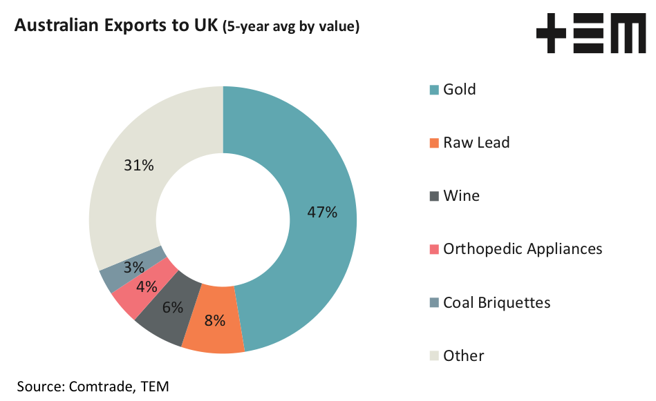 Analysis of top Australian exports to the UK on a trade value basis demonstrates that over the past five years gold has topped the share of value of all export flows, scoring a 47% share of total value of exports to the UK. The only agricultural product to make it into the top five was wine, which came in third and representing 6% of the total export value over the last five years.