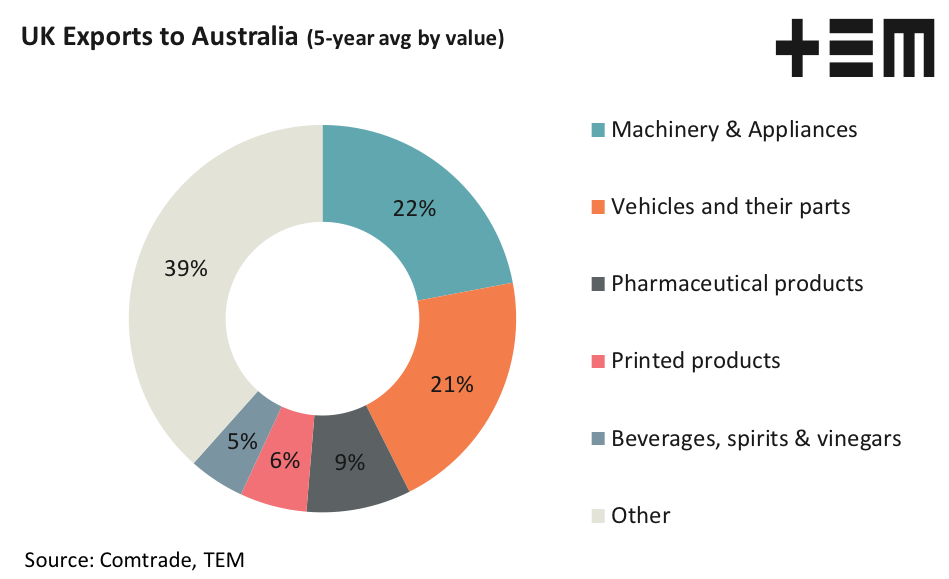 In terms of UK exports to Australia, machinery, appliances and cars (including their parts) feature prominently in trade flows with a 22% and 21% share, respectively. The closest to an agricultural related product on the import side of the equation coming from the UK to Australia in the top five are beverages, spirits and vinegars, which represent 5% of the total value of UK exports to down under.