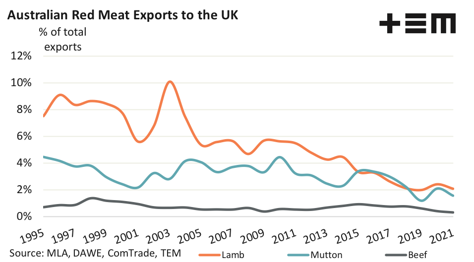 In the last three decades the proportion of lamb exports to the UK as a percentage of total Aussie lamb meat exports has been in steady decline moving from around 8% of exports to 2% in recent years. Mutton exports have shown a more moderate decline, albeit starting from a lower base in 1995 just above 4% of total mutton exports to dip below 2% in the last few years.
