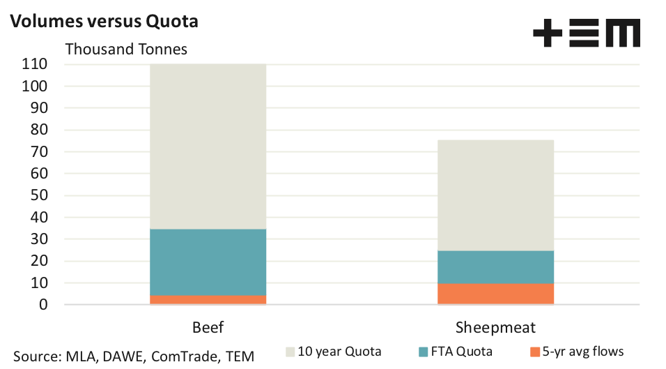 Under the new FTA there is a safe guard quota limit set for beef at 35,000 tonnes per annum, which is set to grow to 110,000 tonnes by the next decade. Similarly the current quota for sheep meat is set at 25,000 tonnes and that is scheduled to grow to 75,000 tonnes by the end of the decade.