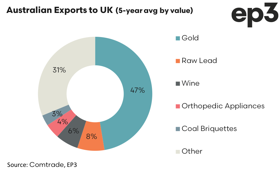 - Gold has topped the share of value of all export flows, scoring a 47% share of total value of exports to the UK over the last five years, on average.