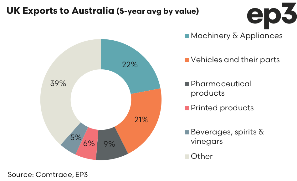 In terms of UK exports to Australia, machinery, appliances and cars (including their parts) feature prominently in trade flows with a 22% and 21% share, respectively. The closest to an agricultural related product on the import side of the equation coming from the UK to Australia in the top five are beverages, spirits and vinegars, which represent 5% of the total value of UK exports to down under.