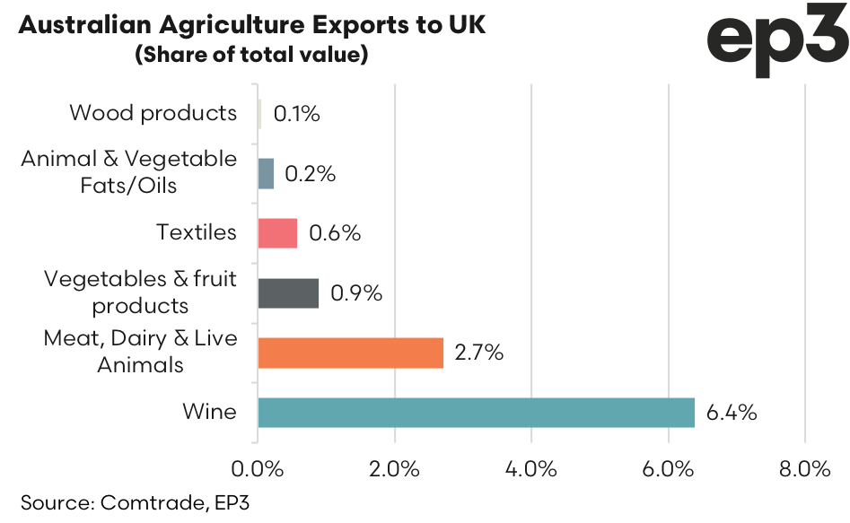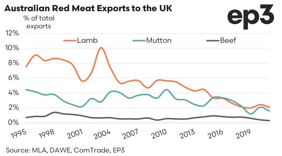 Meanwhile beef exports from Australia to the UK have been flatlining below 1% of total beef export flows for much of the last three decades. It would be fair to say that a UK FTA would open up the opportunity to capture more market share in the UK as there is quite a bit of upside potential available.