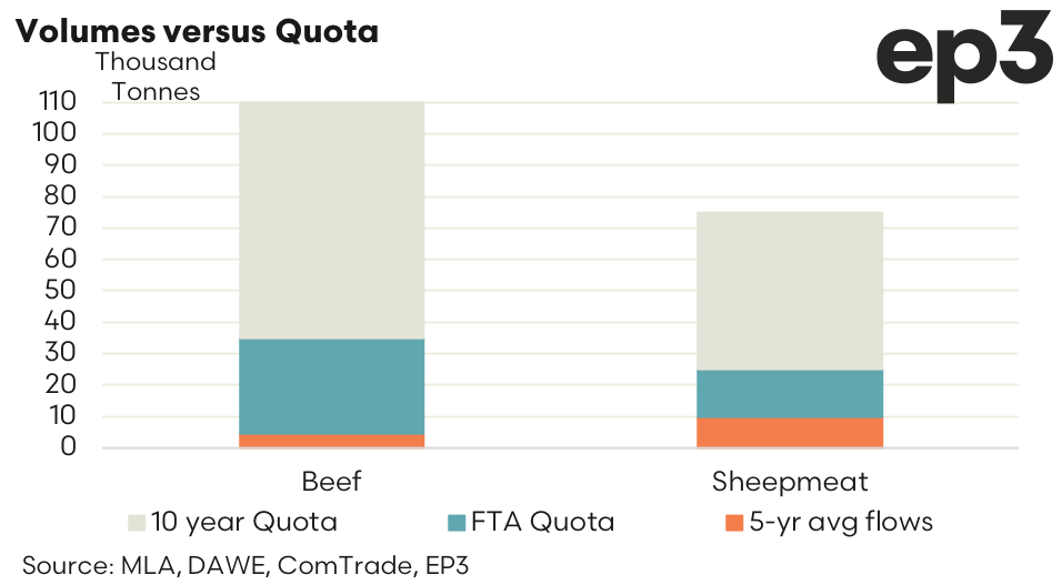 - The initial FTA agreement allows a quota of 35,000 tonnes of beef and 25,000 tonnes of sheep meat to be exported to the UK. Based on recent red meat flows there is plenty of upside to grow this market.