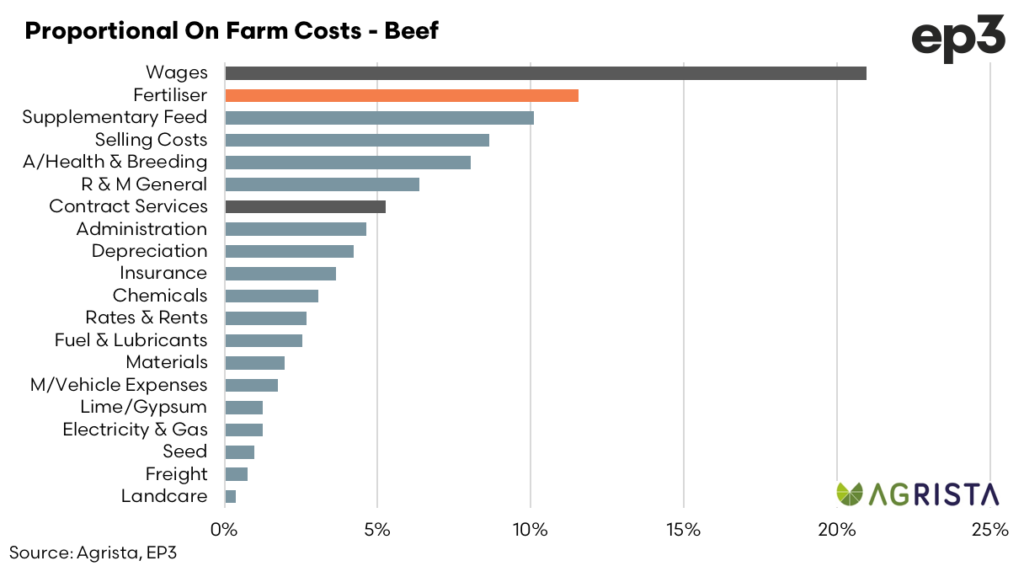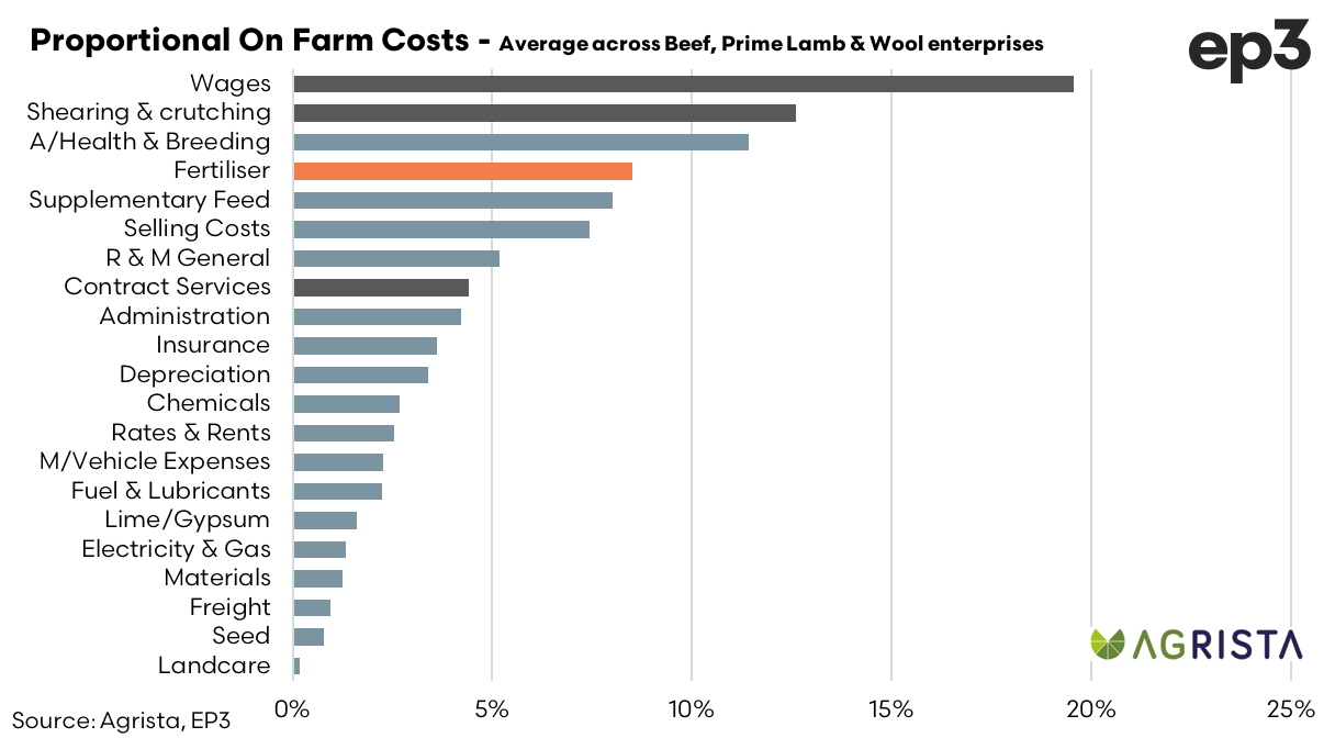 - Across all livestock enterprise types (beef, prime lamb and wool producing farms combined) fertiliser is the fourth costliest spend, at around 8.5% of total on farm costs, on average.