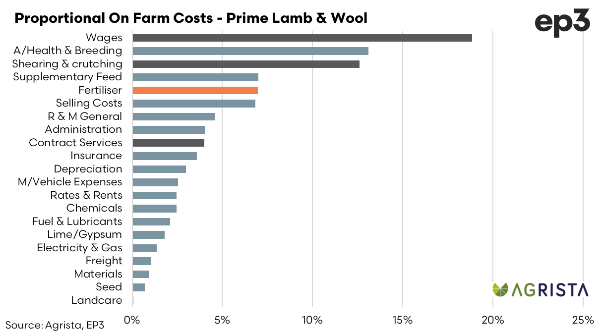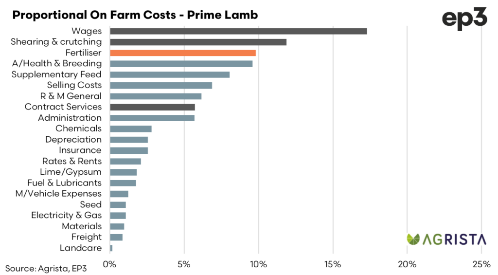 For a beef enterprise the fertiliser spend sits in second place in terms of the costliest spend behind wages and equates to 11.5% of total costs. Prime lamb and wool operations, combined, spend 7.0% of total costs on fertiliser, which is the fifth costliest spend.