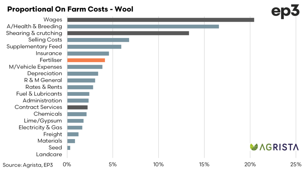 However, as individual operations the prime lamb enterprise spends about 9.8% of their total costs on fertiliser, which is the third placed costliest spend behind wages and shearing/crutching costs. Meanwhile for a wool producing operation fertiliser costs account for just 4.1% of total costs and drops to seventh place, in terms of the costliest spend.