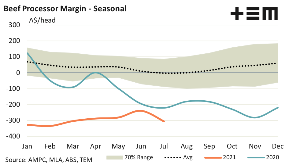 The net result was a drop in the monthly beef processor margin, according to the EP3 model, with the July 2021 average loss per head of cattle processed coming in at $305, widening by 28% from the $239 loss per head recorded in June*. This brings the annual average processor margin to a loss of $297 for the 2021 season.