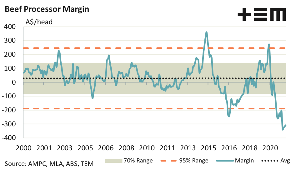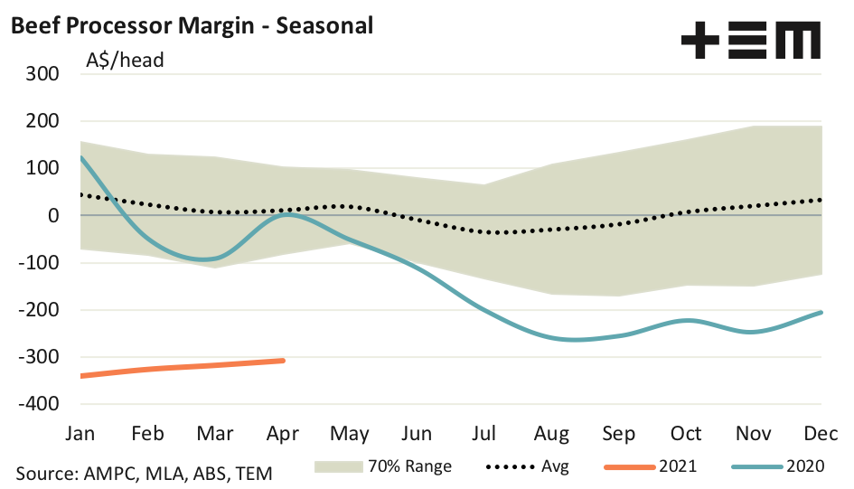 The Episode3 beef processor margin model for April 2021 shows a slight improvement for processor bottom lines, but the model still suggests average losses over the month in excess of $300 per head of animal slaughtered.