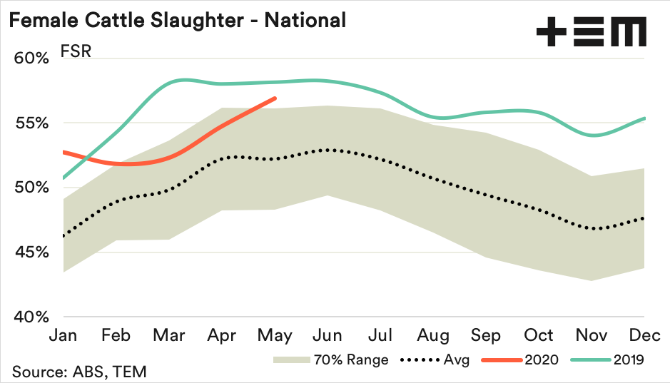 The female slaughter ratio (FSR) measures the percentage of female cattle processed as a proportion of total cattle slaughter. Australian Bureau of Statistics data for May shows that the FSR stubbornly refuses to soften recording the highest level this season at 56.9%.