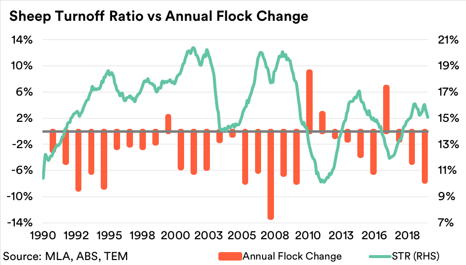 As highlighted when compared to the annual change in the flock, the EP3 version of the STR shows that since 1990 a turnoff ratio below 14% was consistent with a flock rebuild, while above 14% was a signal that liquidation phase was in place.
