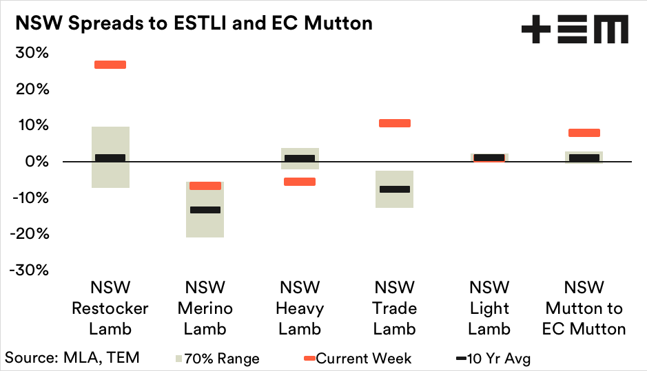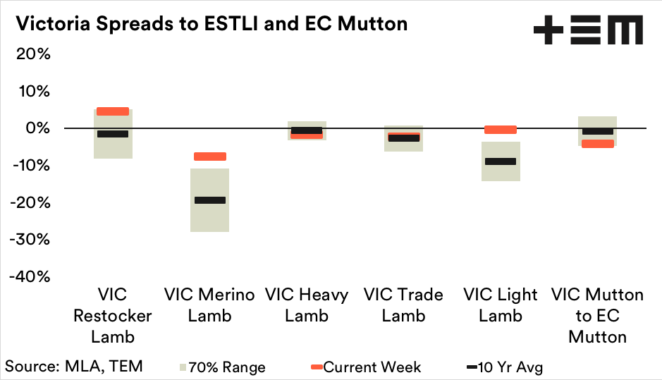 As of last week’s closing prices, the NSW Restocker Lamb spread remains at a 27% premium to the ESTLI. In contrast, the Victorian Restocker Lamb spread is managing near a 5% premium to the ESTLI.