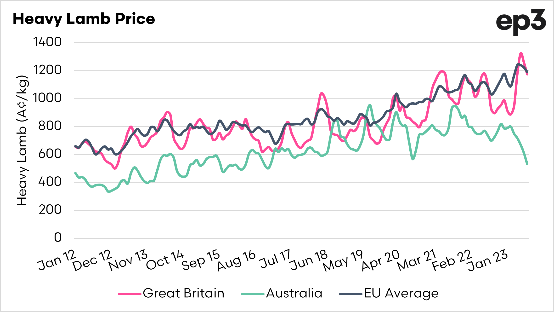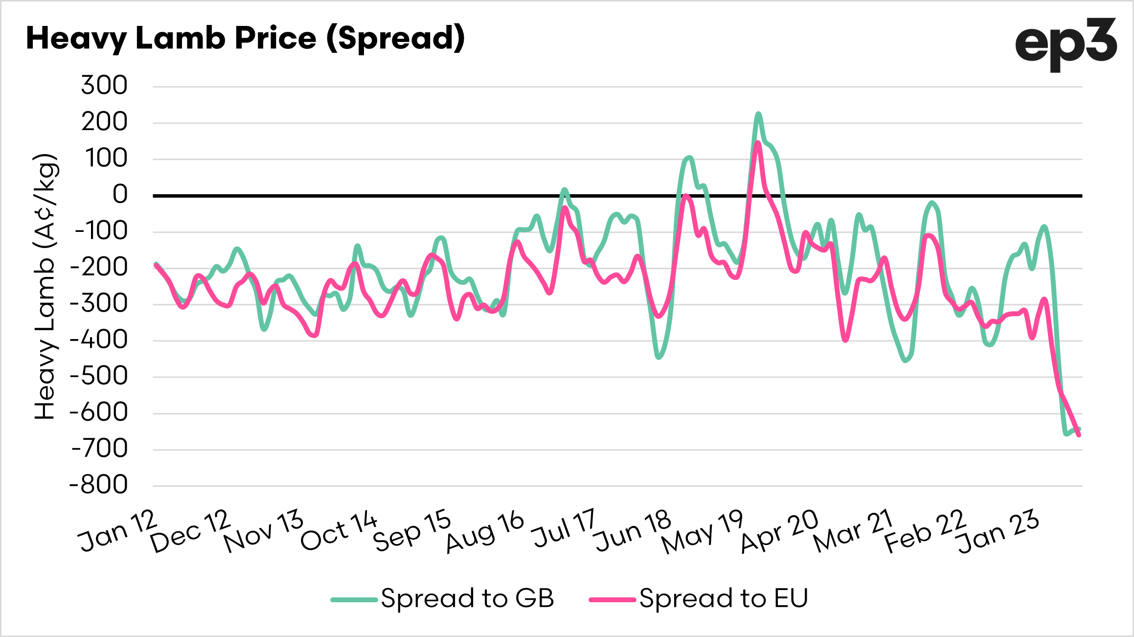 The first chart below shows the heavy lamb price for the UK, Australia and France. The second chart shows the spread between these markets and Australia, to highlight the scale of the discount.