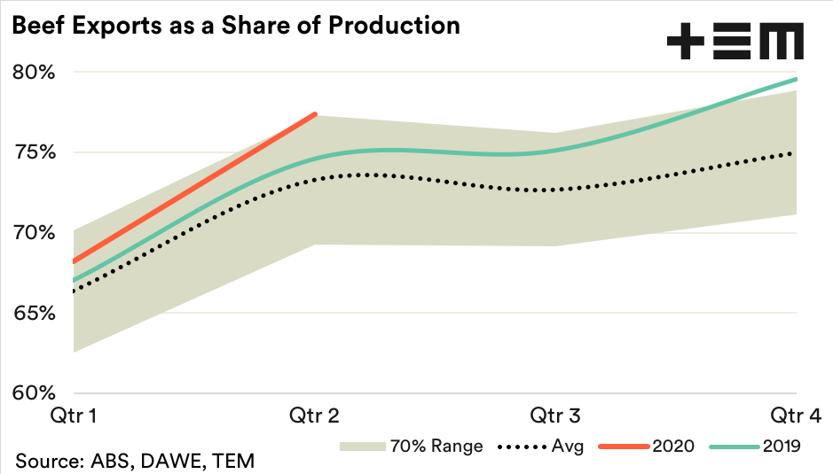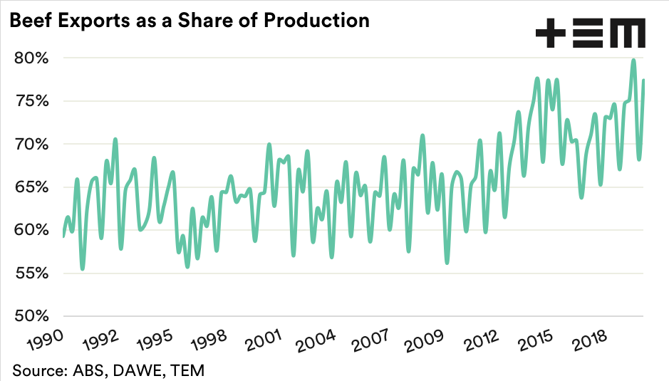 Annual Australian beef exports have averaged more than 70.0% of production over the last five years. Prior to 2010 this proportion was closer to 65.0%.