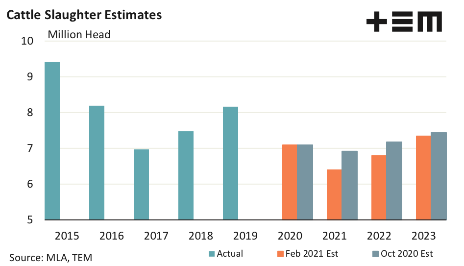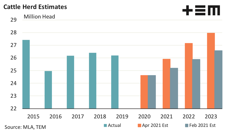 Meat and Livestock Australia (MLA) recently released their quarterly cattle market outlook and there have been some significant revisions to the pace of the herd rebuild in their estimates. The April outlook shows the Australian herd is expected to reach 25.9 million head in 2021, a gain of 2.9% on their earlier estimates from February.