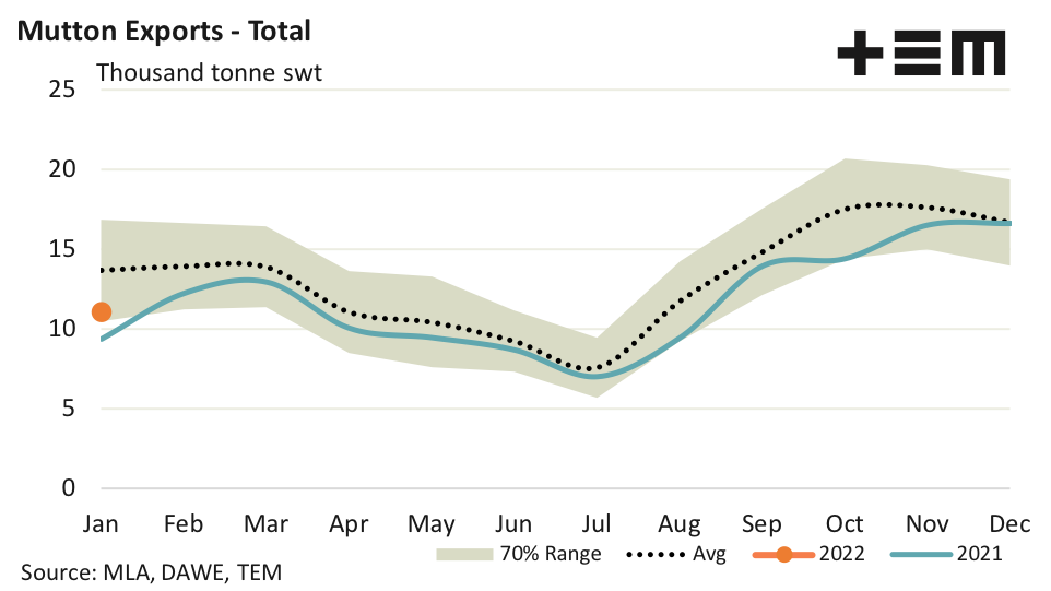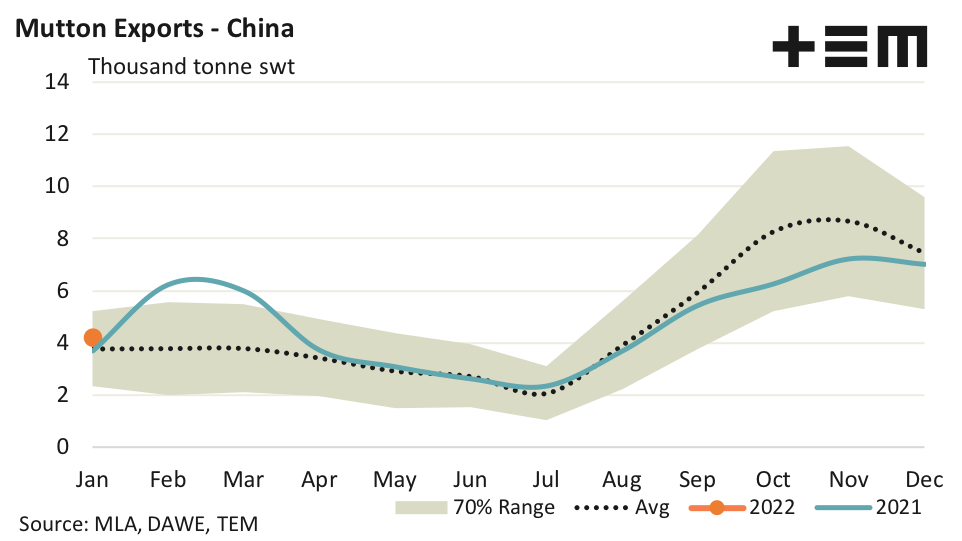 Total mutton export volumes from Australia have started 2022 at 11,128 tonnes swt, which is 19% higher than January 2021 but also 19% under the January seasonal trend, according to the five-year average pattern. China, is by far the largest offshore market for Aussie mutton exports and demand has started the year strongly with January volumes coming in at 4,213 tonnes, which represents levels that are 14% higher than last January and 11% above the five-year January average.