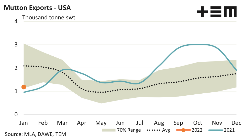 The USA has started the 2022 season stronger than in 2021, but after a very robust second half of the season in 2021 volumes are now back under the January five-year average by 43% with 1,187 tonnes swt reported as exported. Along with the softer USA figures, Aussie mutton exports to “all other destinations” (excluding China and the USA) have also come in well under trend with 5,729 tonnes reported exported for January 2022, 27% below the January average for the last five years.