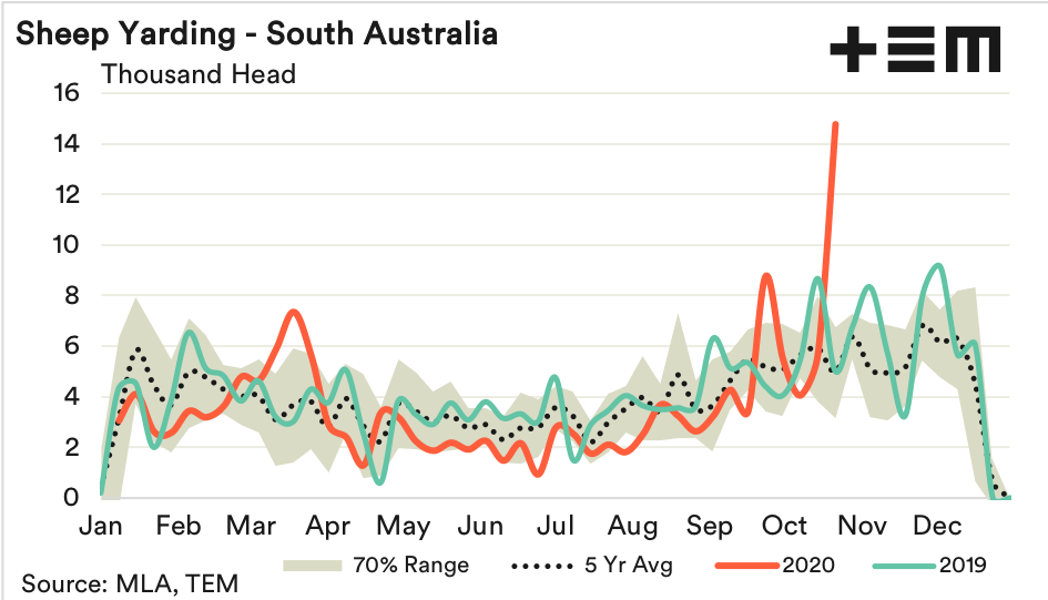 Sheep yarding levels in South Australia lifted 159% on the week prior to hit 14,773 head. This is the highest weekly yarding of sheep in SA since 2009 and significantly above the normal range that you would expect to see presented.