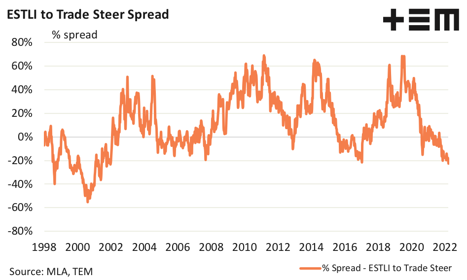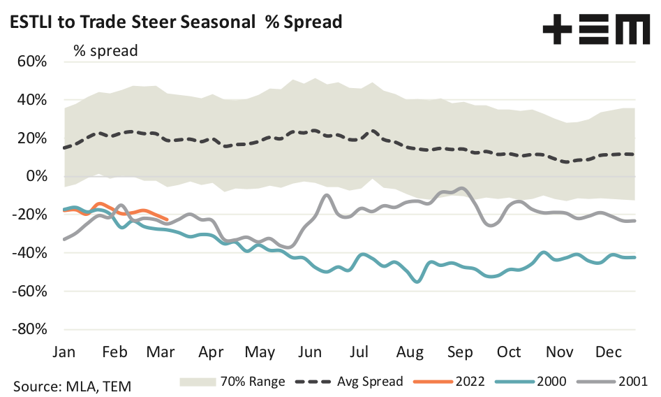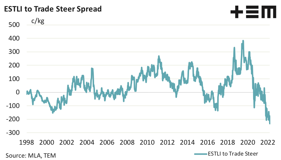 The cents per kilogram spread between ESTLI to Trade Steer has widened to its largest discount in decades in the last few weeks, moving to 233 c/kg discount as of mid-March.