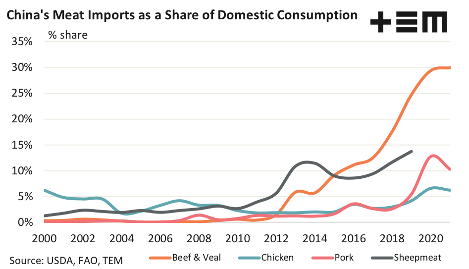 A good measure that highlights the growth in Chinese demand is the proportion of meat imports relative to their domestic consumption of each meat protein.