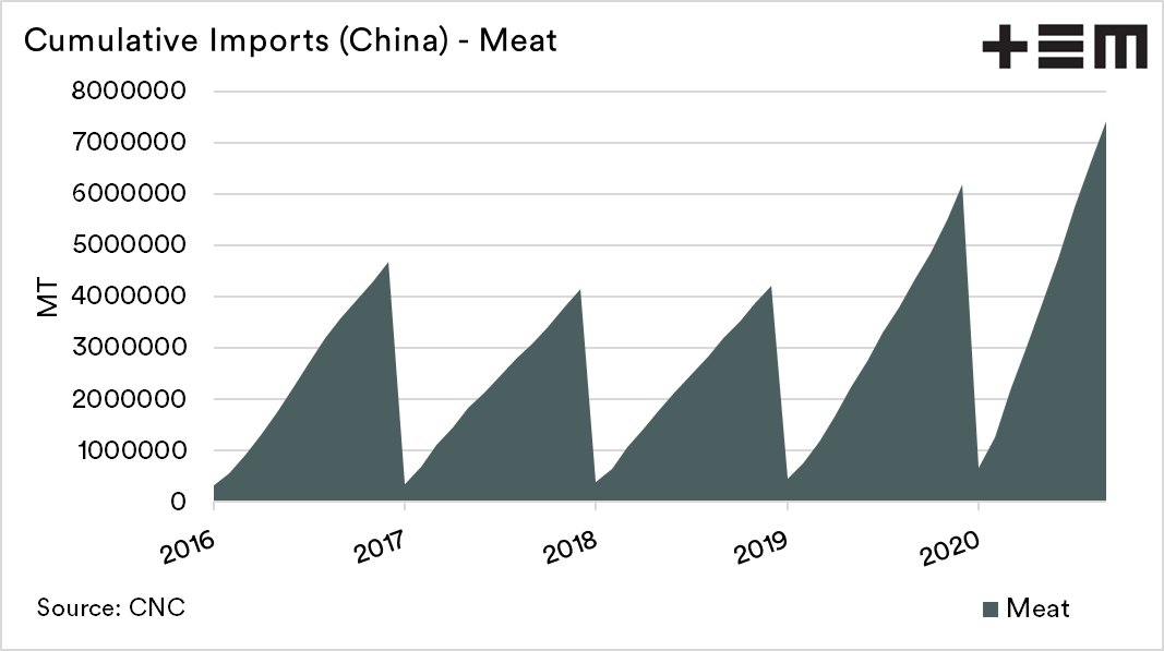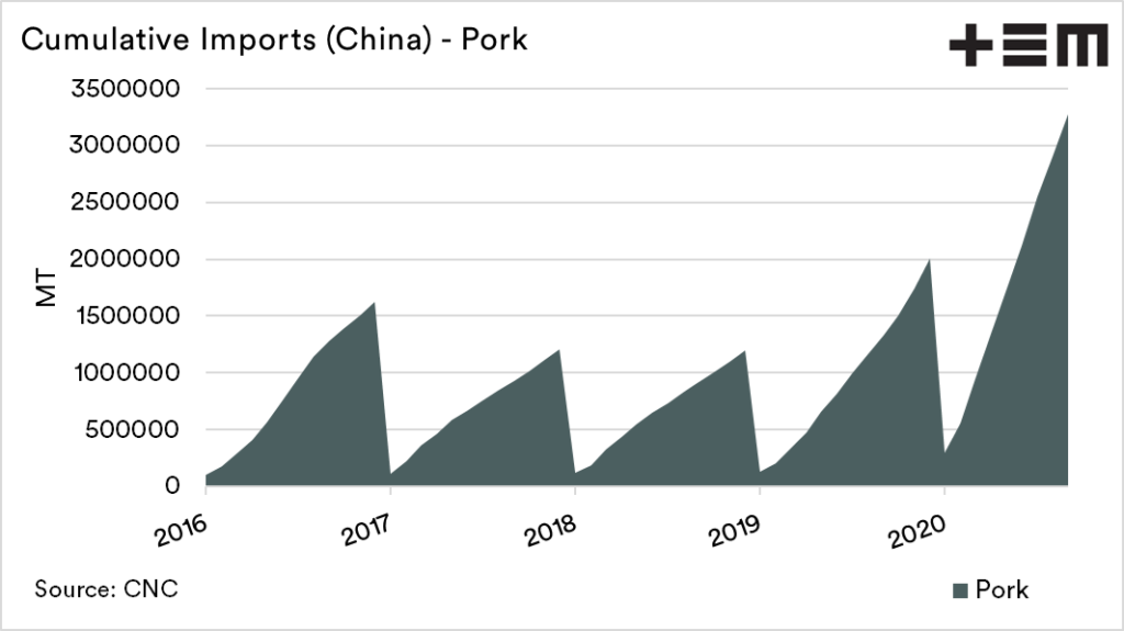 Pork: In an article during October we questioned whether the pork herd rebuild was as effective as lead to believe (see here). At present pork imports have reached 3.28mmt for the year, up 147% versus this time last year. The total imports for the month of September were up to 380kmt, versus 350kmt during August.