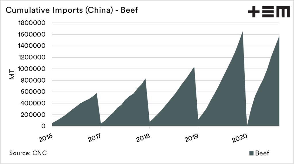 The overall import of beef into China has remained strong. It is likely that during October the full year (2019) imports will be exceeded with two months remaining.